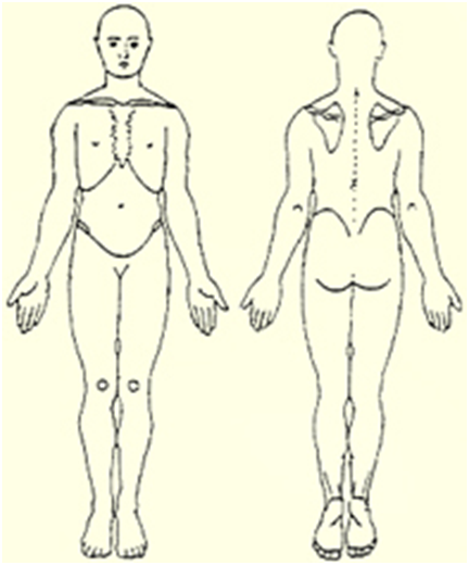 The main problem is usually recorded on a body chart, all which have similar features & all are similarly asexual. The chart on the left is a more or less standard view of one. It shows an anterior & posterior view of the body & shows it in the anatomical position. Some departments will have their own symbols for describing pain, stiffness, acute, chronic, whether it radiates, etc.